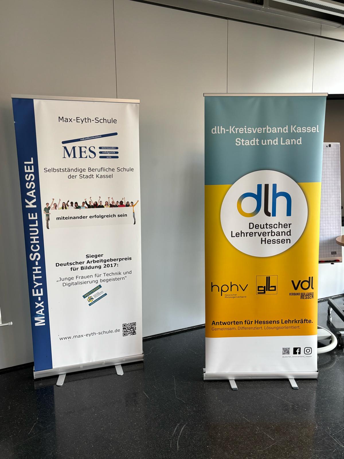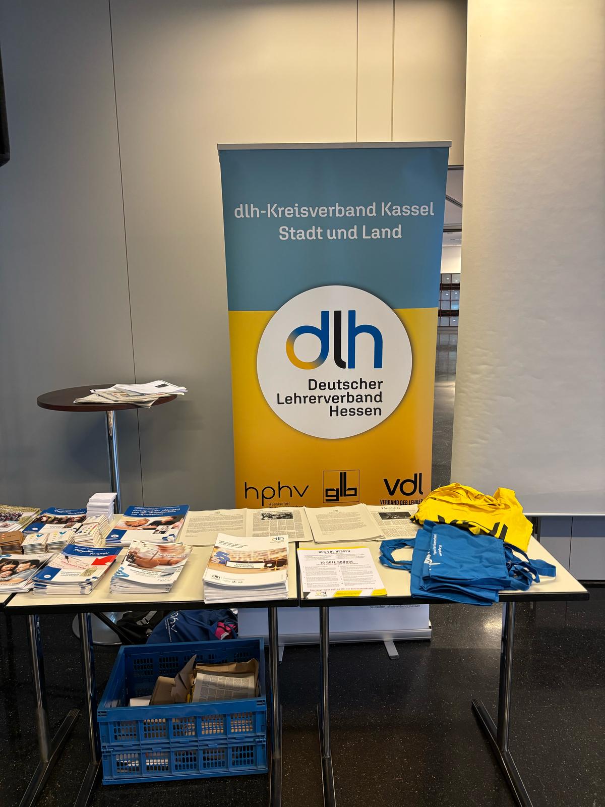 Die Veranstaltung begann mit einem kleinen dlh-Werbeblock, in dem sich Timo Marx und Klaus Grün als Kreisvorsitzende von vdl und glb vorstellten sowie der Moderator der Fortbildung, Boris Krüger, als hphv-Bezirksvorsitzender Nordhessen und dlh-Landesvorsitzender. Die drei fassten die Ziele des dlh in kurzen, aber eindringlichen Worten zusammen und machten vor allem die Unterschiede zur GEW deutlich. Zu diesem Zweck lagen auch Broschüren und Give Aways des dlh und seiner Gliedverbände aus, die reichlich von den Teilnehmerinnen und Teilnehmern mitgenommen wurden. Neben der Broschüre zur Elternzeit stießen insbesondere Kugelschreiber und Haftnotizen auf großen Anklang.