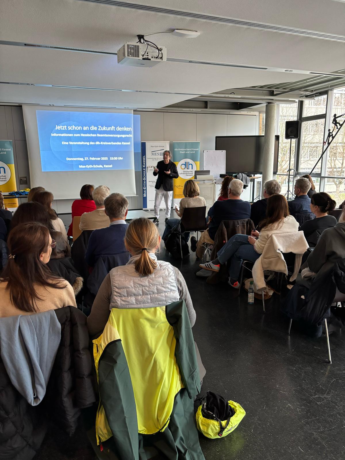 Der dlh-Kreisverband Kassel hatte für den 27. Februar 2025 zu einer Informationsveranstaltung über Fragen der Beamtenversorgung und des Ruhestands eingeladen. Knapp 50 Lehrkräfte aus Kassel und ganz Nordhessen, aber auch aus Fulda und sogar aus Frankfurt nahmen daran teil. Sie versammelten sich bei Kaffee, Keksen und Kaltgetränken im Großen Konferenzraum der beruflichen Max-Eyth-Schule, den der dortige glb-Schulobmann, Claus Grün, zur Verfügung gestellt hatte.