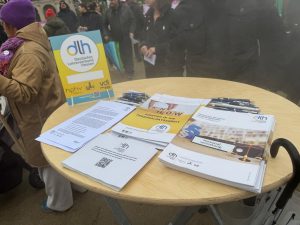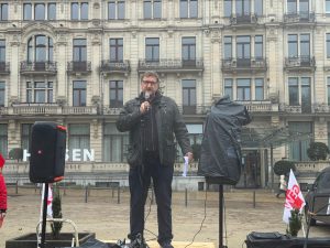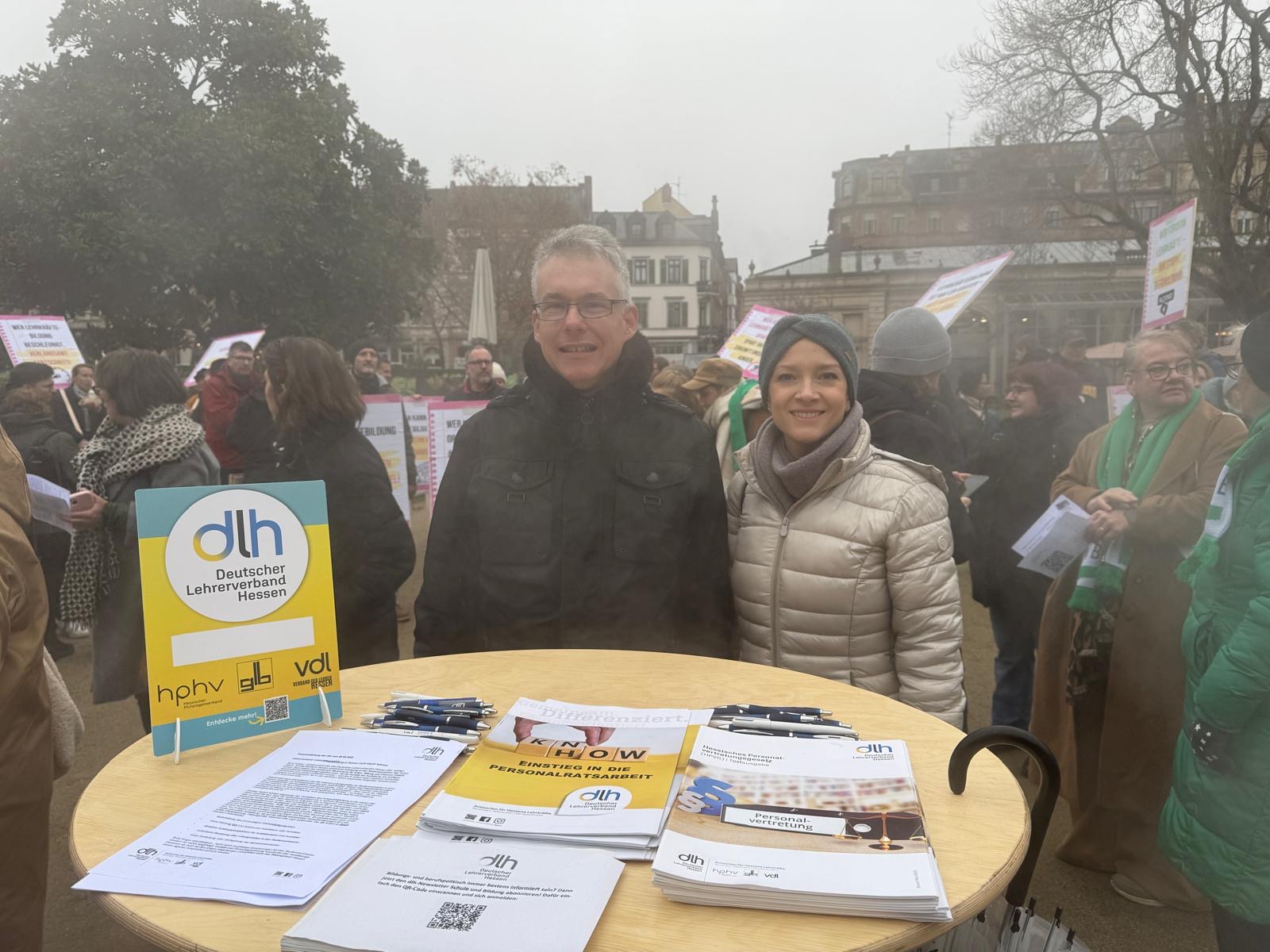 Den Stand des dlh betreuten die Wiesbadener Kreisvorsitzende Ann Kristin Schallich und Lothar Wiesemann. Von der dlh-Fraktion im GPRS Wiesbaden waren ebenfalls Caro Fottner und Lutz Vollbracht anwesend. Am Open Mic sprach eindringlich für den dlh Volker Hahl, der am Lessinggymnasium in Lampertheim unterrichtet und Ausbilder am Studienseminar Heppenheim ist, also ein direkt Betroffener der Sparpläne der Landesregierung.