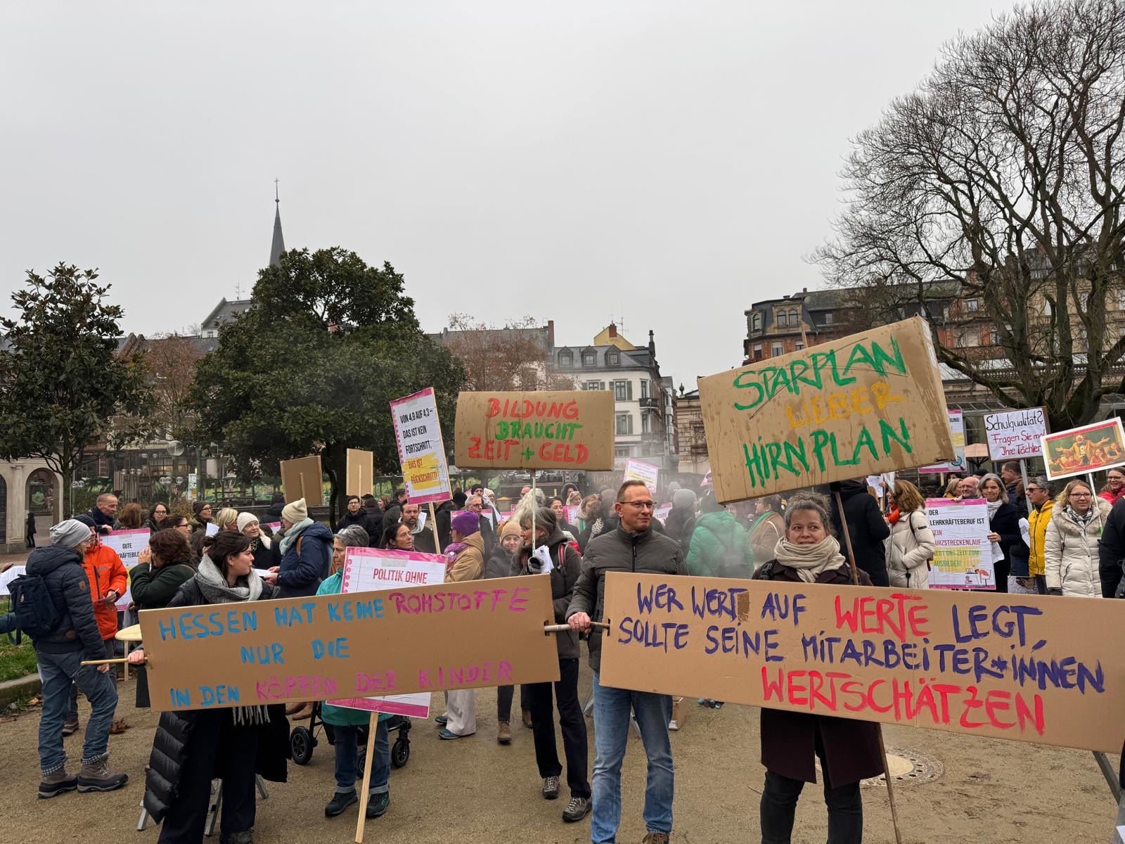 Am Samstag, 29. November, hat eine Bildungsgemeinschaft auf dem Kranzplatz in Wiesbaden ein deutliches Zeichen gegen die geplanten Kürzungen der Hessischen Landesregierung in der Lehrerausbildung gesetzt. Unter dem Motto „Bildung geht uns alle an!“ verwandelte sich der Platz in ein gut besuchtes Familienfest, das Protest und Austausch miteinander verband.