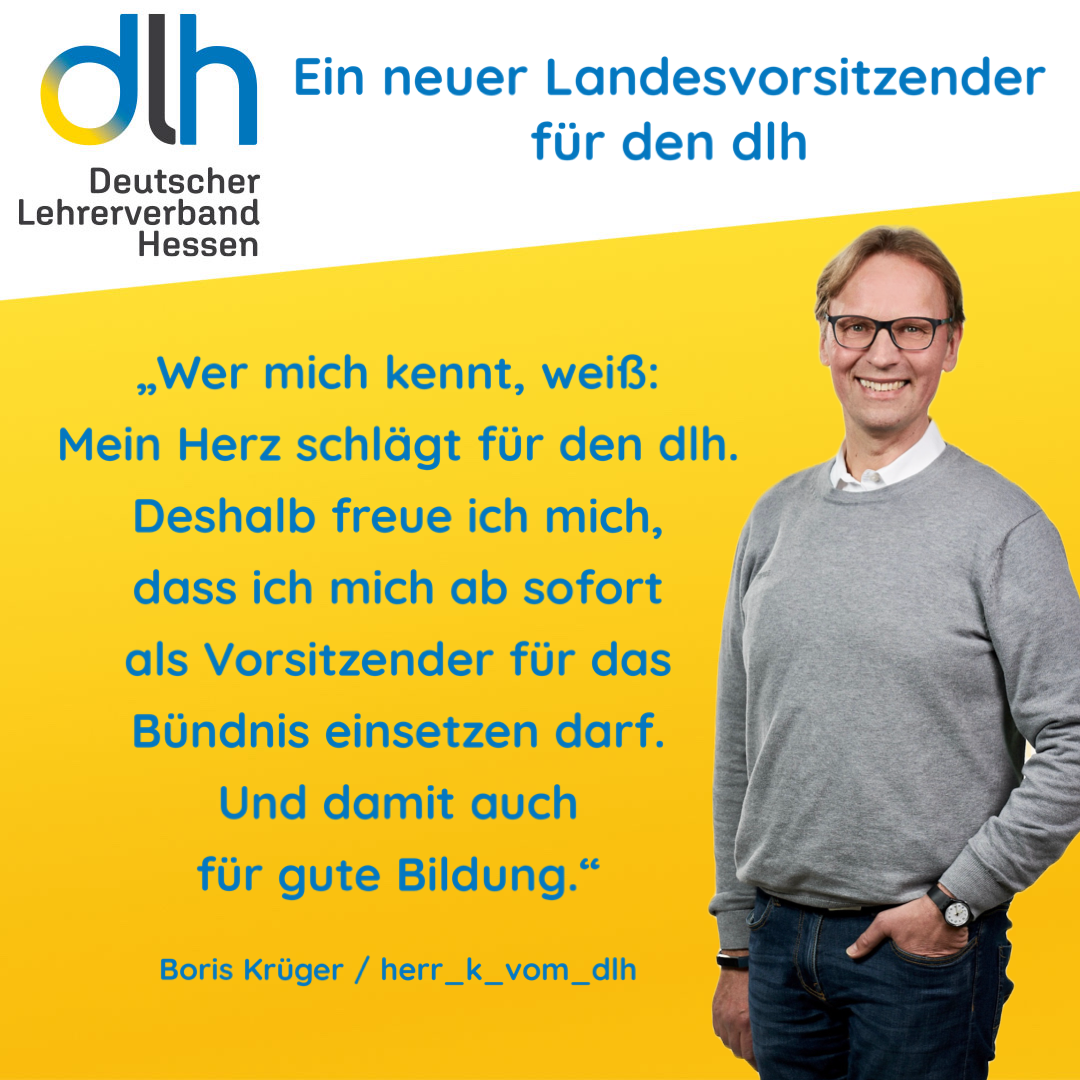 Boris Krüger, der Vorsitzende des Kreisverbandes Kassel des Deutschen Lehrerverbandes Hessen (dlh), ist neuer dlh-Landesvorsitzender. Auf einer Sitzung der Landesleitung in Fulda wurde er einstimmig in dieses Amt gewählt. Krüger wird damit in den nächsten vier Jahren das Wahlbündnis der drei im Deutschen Beamtenbund Hessen organisierten Lehrerverbände glb, hphv und VDL koordinieren und deren Wahlkampf für die Mitte Mai anstehenden Personalratswahlen im Schulbereich mitorganisieren.