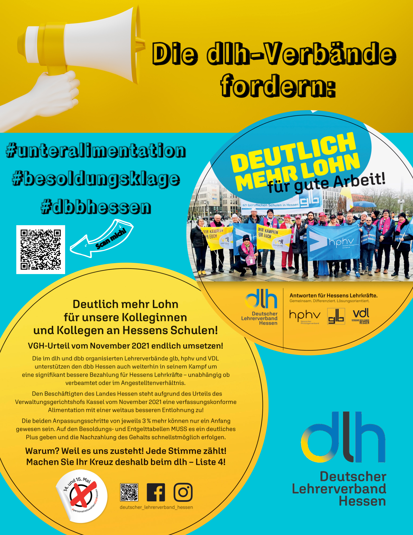 Die im dlh und dbb organisierten Lehrerverbände glb, hphv und VDL unterstützen den dbb Hessen auch weiterhin in seinem Kampf um eine signifikant bessere Bezahlung für Hessens Lehrkräfte – unabhängig ob verbeamtet oder im Angestelltenverhältnis.