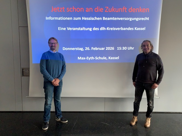 Auf großes Interesse stieß auch in diesem Jahr die Informationsveranstaltung des dlh-Kreisverbandes Kassel zum Thema Beamtenversorgung und Ruhestand am 26. Februar 2026. Knapp 30 Lehrkräfte aus Kassel und ganz Nordhessen folgten der Einladung in den Großen Konferenzraum der beruflichen Max-Eyth-Schule. Für einen angenehmen Rahmen mit Kaffee, Gebäck und Getränken war gesorgt. Der Raum wurde dankenswerterweise vom dortigen glb-Schulobmann Claus Grün zur Verfügung gestellt. Eine kurze Begrüßung gab es durch den Schulleiter der MES, Herrn Otto.