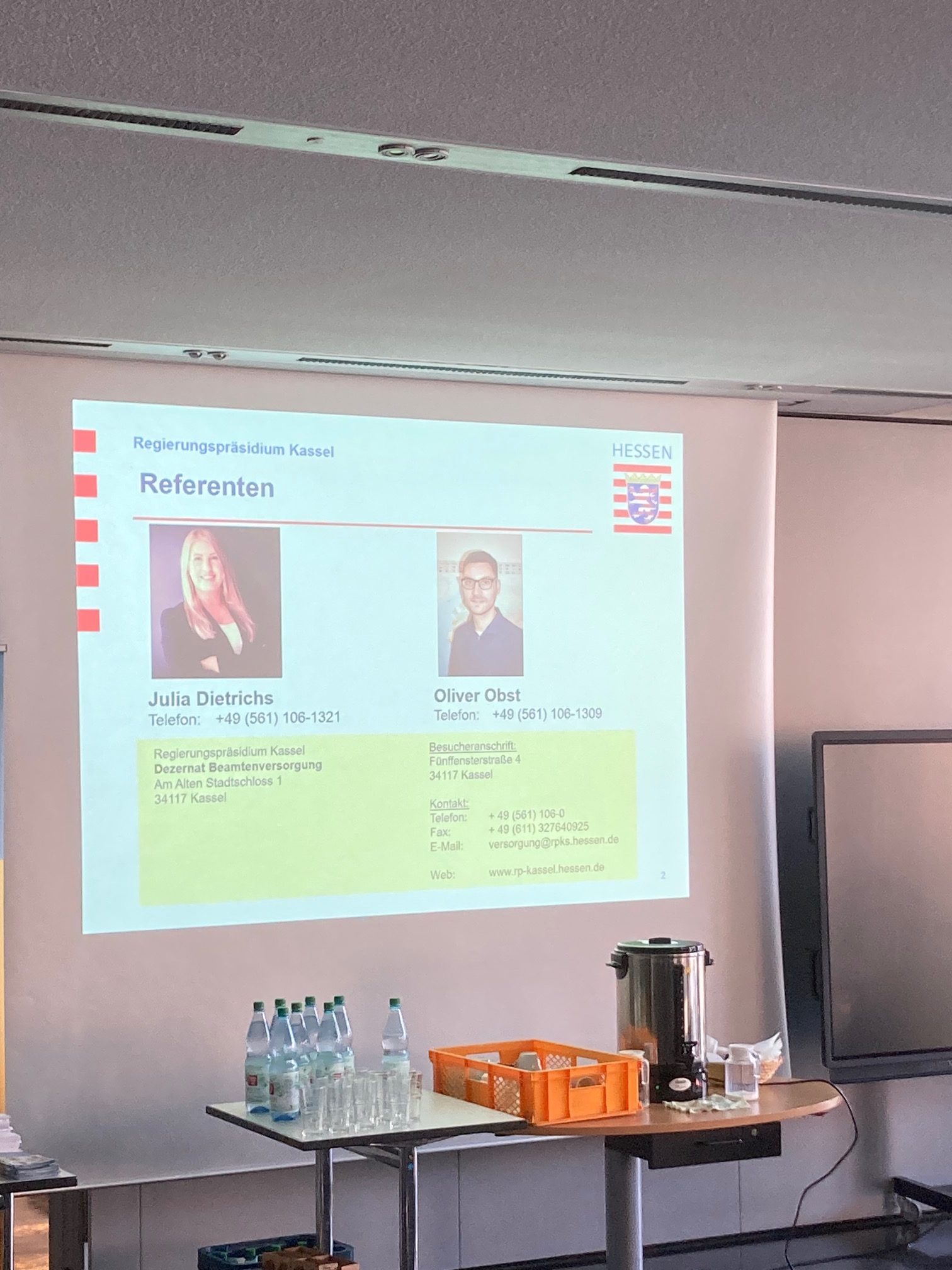 Frau Dietrichs und Herr Obst vom Regierungspräsidium Kassel informierten sachkundig und anschaulich zu allen Aspekten, die im Hinblick auf Ruhegehalt, Mindestversorgung Hinterbliebenenversorgung usw. zu beachten sind. Dabei gab es viele Ohs und Ahs im Raum, da dem Publikum vieles noch nicht bekannt war. Die beiden Referierenden beantworteten geduldig und kompetent alle noch so detaillierten Fragen der anwesenden Lehrkräfte, etwa zu Dienstzeiten an einer Universität und im Privatschuldienst.