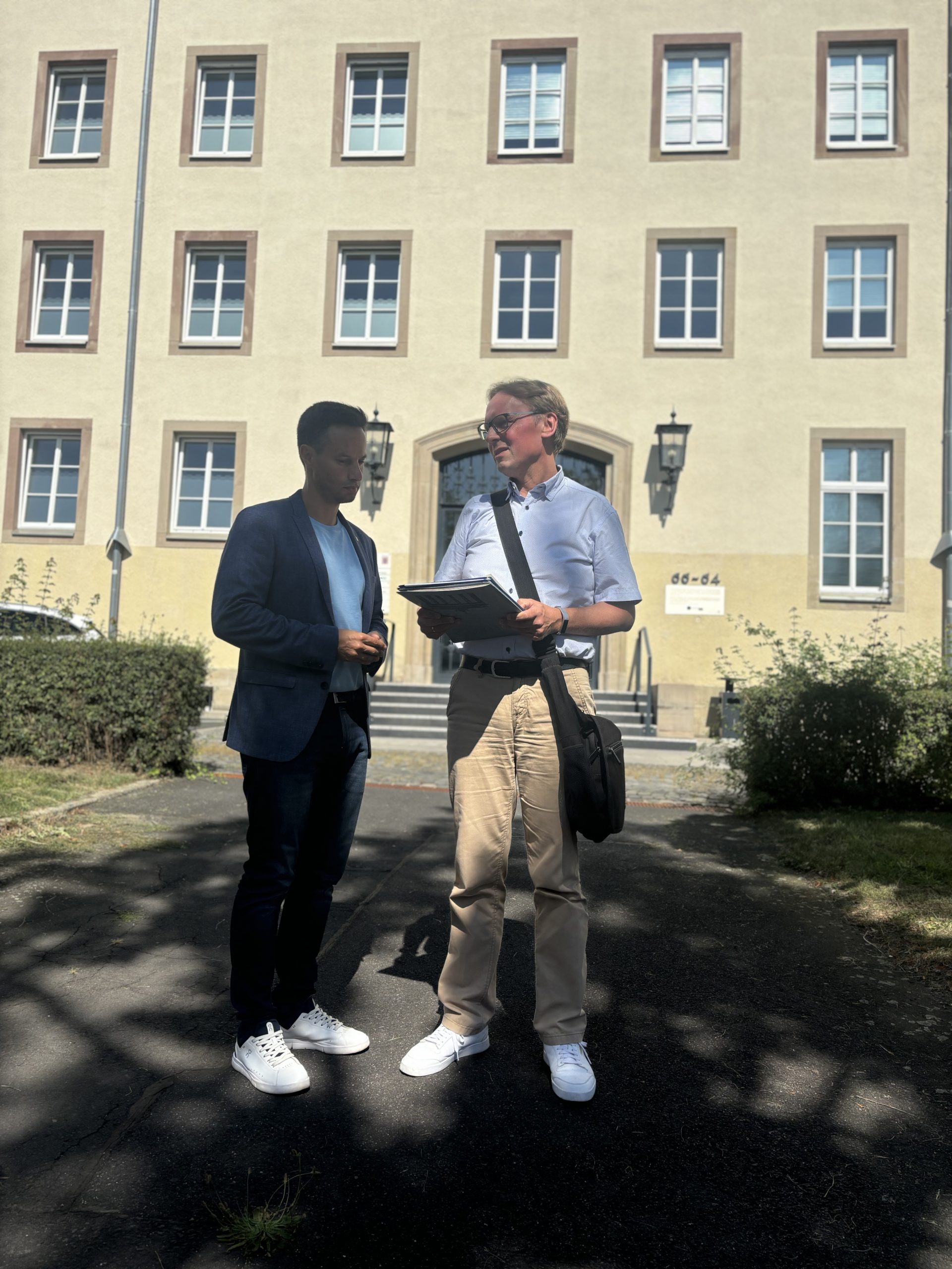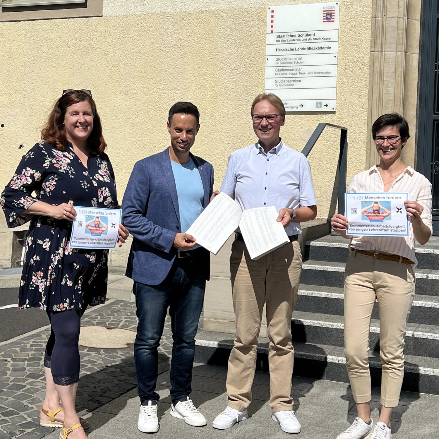 Am 28.08.2024 haben Victoria Hildebrand und Boris Krüger von den Jungphilologen Hessen und Kerstin Mück vom jungen VDL vor dem Staatlichen Schulamt Kassel eine Petition mit 1121 Unterschriften an Oliver Ulloth, SPD-Mitglied und Vorsitzender des Petitionsausschusses im Hessischen Landtag, übergeben. Die Petition fordert die Landesregierung Hessen auf, die Sommerferienarbeitslosigkeit junger Lehrkräfte nach dem Vorbereitungsdienst und vor dem ersten Vertrag zu beenden.