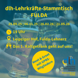 📅 Lehrkräfte-Stammtisch🕖 19 Uhr📍 Leipziger Hof, Fulda-Lehnerz🍺 Das erste Kaltgetränk geht auf uns!
